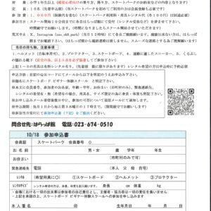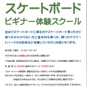 蔵王みはらしの丘スケートパーク (蔵王みはらしの丘ミュージアムパーク内) 営業時間 9時~17時(秋期は日没まで) 営業期間 4月1日~11月最終日曜日(冬期間閉場) 休場日:毎週月曜日(月曜祝日の場合は翌平日)雨天休場 ※スケートボード、インラインスケート専用のスケートパークです。